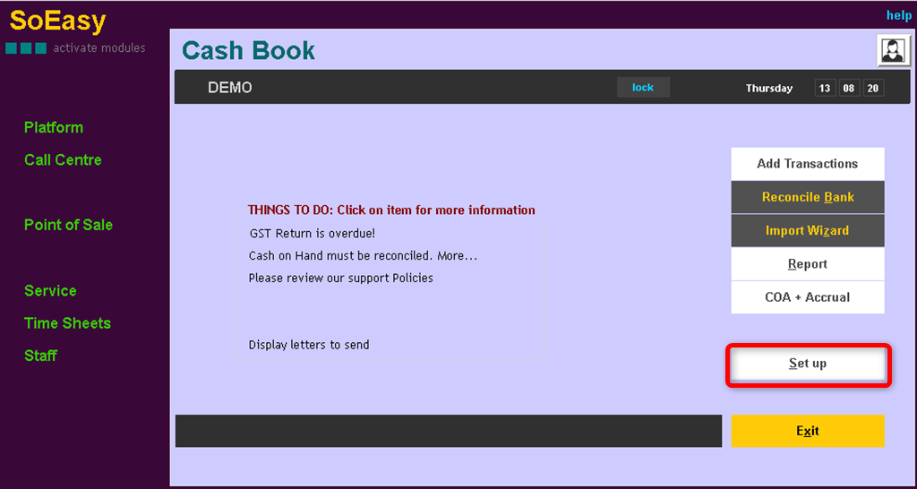 1. Go to Cash Book > Setup